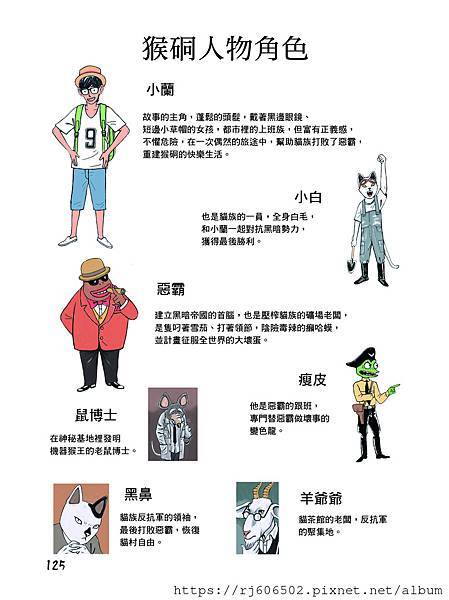 環繞著猴硐車站、猴硐商圈、猴硐貓村,凌群在這場為人熟知的景點中,創造出擬人貓群有著反抗軍領袖黑鼻、小白,還有暗黑惡霸賴蛤蟆、跟班混混變色龍、神秘基地的鼠博士、驅策奴隸要征服世界的機器猴王.,譜出了一個充滿驚奇、抗暴求生的勵志故事。